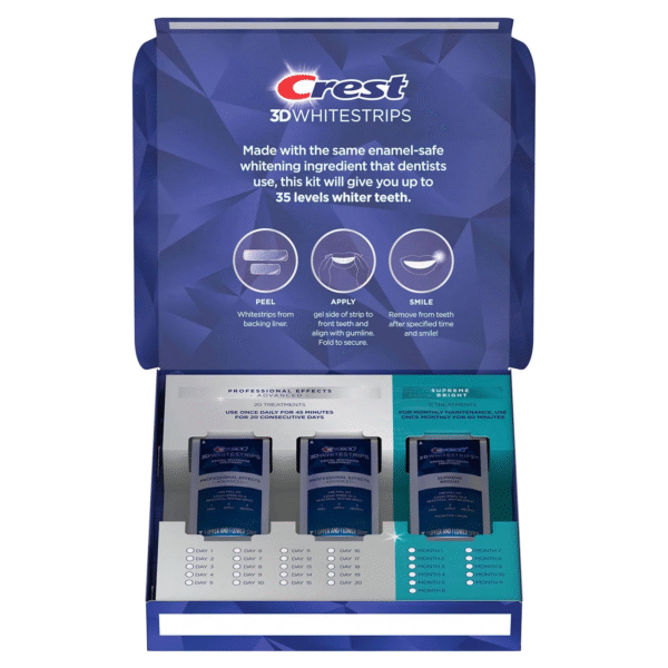 Crest 3DWhitestrips Professional Effects Kenya customers love delivers professional-strength whitening right at home. This bonus pack includes Supreme Bright Boost strips for extra whitening power—perfect for tackling stubborn stains from coffee, tea, or wine. The flexible, enamel-safe adhesives ensure comfortable wear and even coverage. With just 30 minutes daily, users see brighter, more radiant smiles in days. Ideal for busy individuals seeking expert-level results without the dental chair. Shop now and transform your smile with OralCare Kenya.